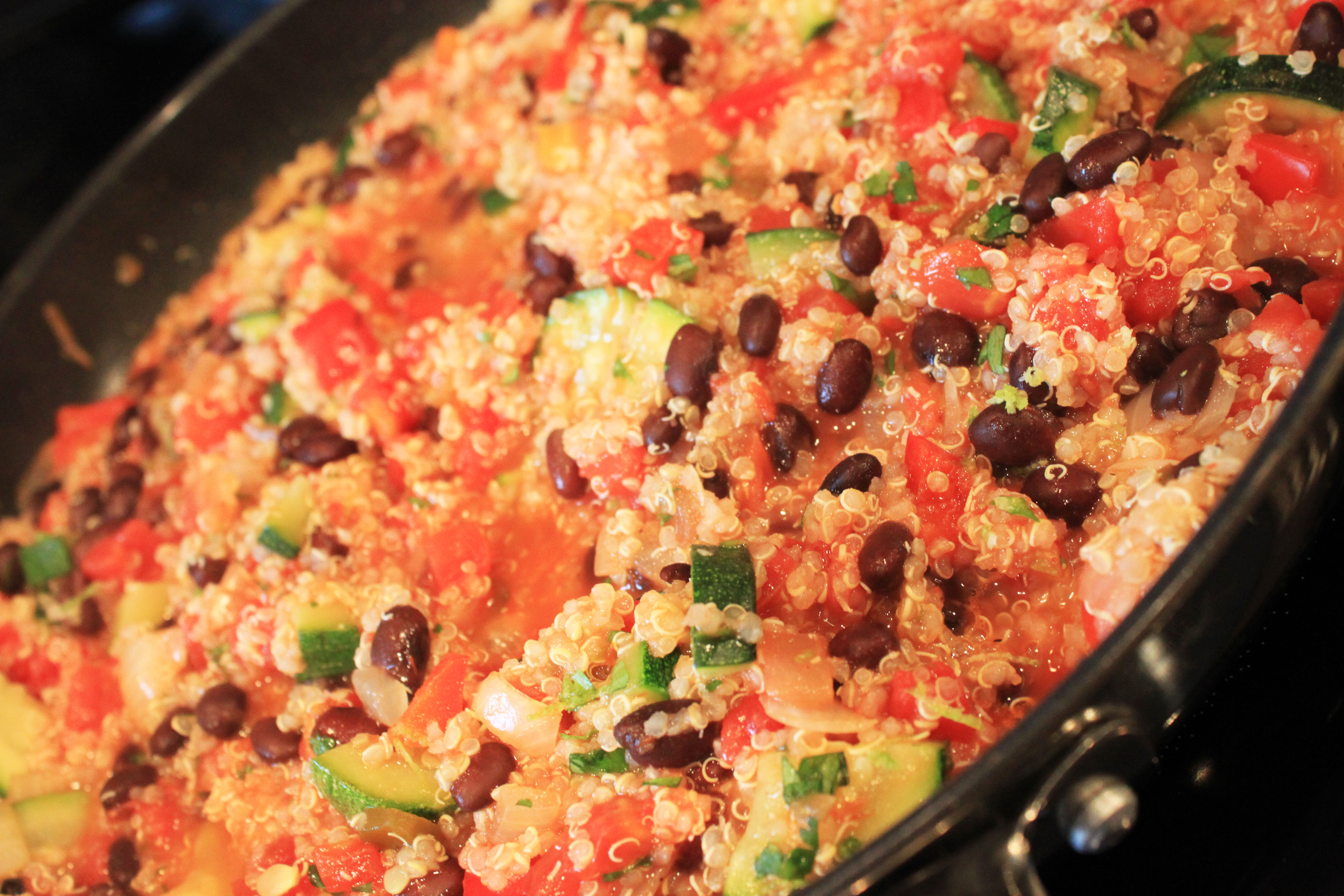 Meanwhile sauté garlic, onion, peppers, and zucchini in extra virgin olive oil in large skillet. Add chili powder. Add quinoa once vegetables are cooked (zucchini should be soft, but not mushy). Add can of petite diced tomatoes with juice, black beans, salsa, cilantro, lime juice, and lime zest. Allow to simmer until ingredients are warmed through.