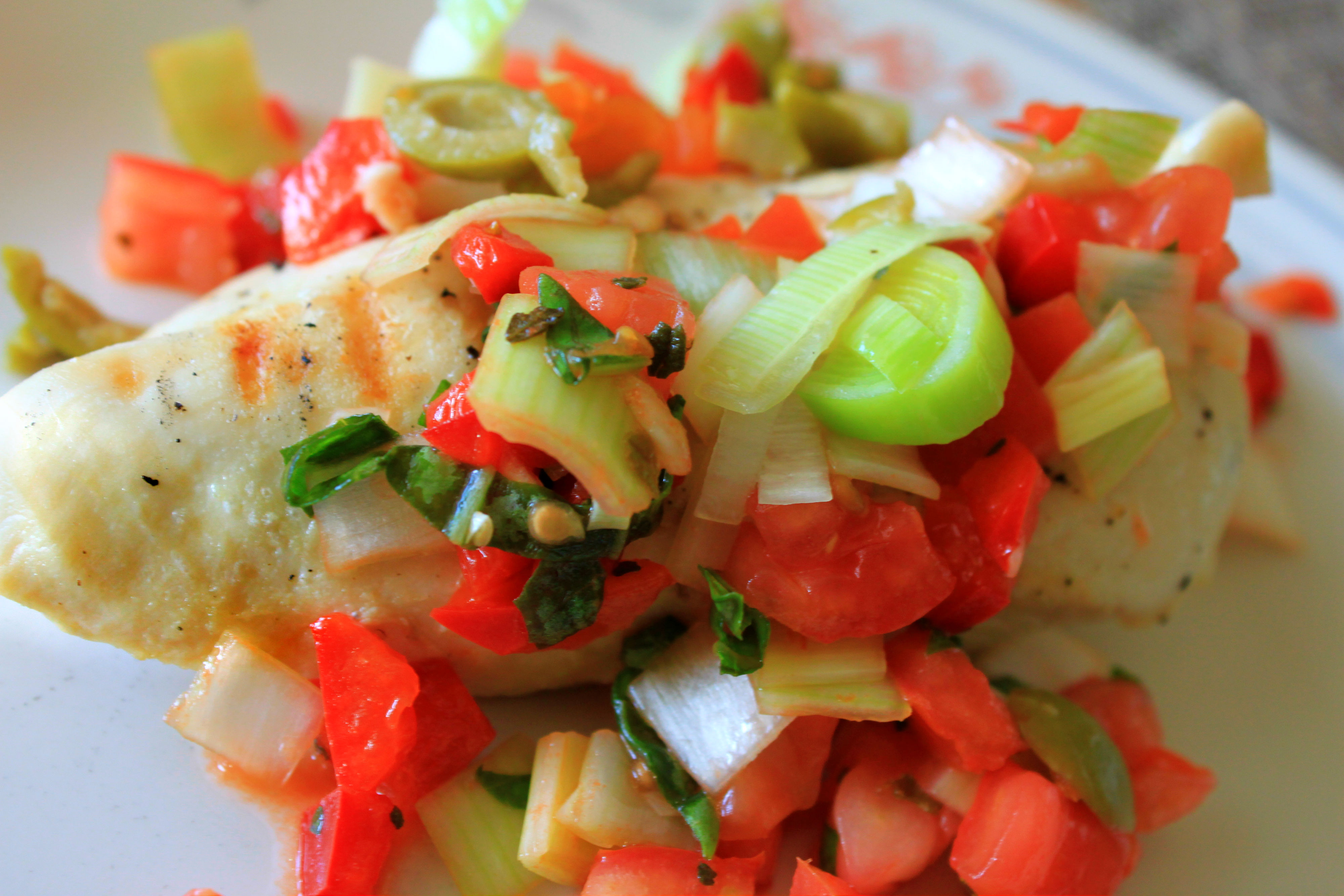 We had our meal with a fresh garden salad and some homemade garlic toast. Top your chicken with the tomato mixture and leeks and enjoy. We also added some chopped olives…mmm…olives!