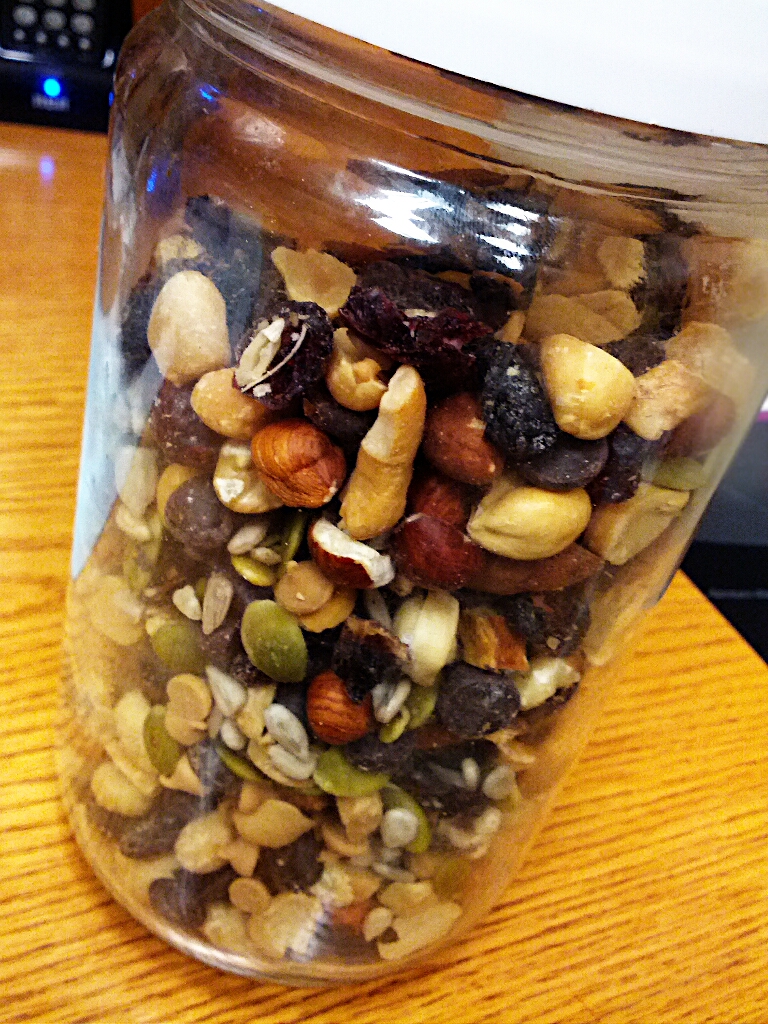 Jonesin’ for a snack? Instead of reaching for the box of processed crackers, the bag of greasy potato chips, or the stash of sweets try munching on some mixed nuts. Make your own trail mix in the bulk section of the grocery store and just keep a jar of it on hand. This just happens to be a photo of my trail mix goodie jar at work.