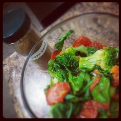 I had some leftover spinach from the lentil recipe on Tuesday, so I’ve been using it for lunches. This morning I threw some frozen broccoli, a handful of spinach, a garden tomato, a sprinkle of parmesan cheese, and a dash of the garam masala spice blend into a container and packed it in my lunch cooler along with a hard boiled egg. When lunchtime rolled around at the clinic I cut the tomato into chunks and heated everything for about 3 minutes in the microwave. Who would have thought such a random assortment of vegetables would have been so tasty. This could be good over a bit of rice, quinoa, lentils, or whatever grain sounds good to you.